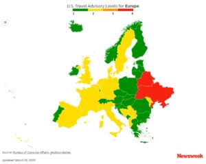 has developed a map highlighting areas across Europe with current U.S. travel advisories in effect, showing that both Romania and Bulgaria fall under the lowest